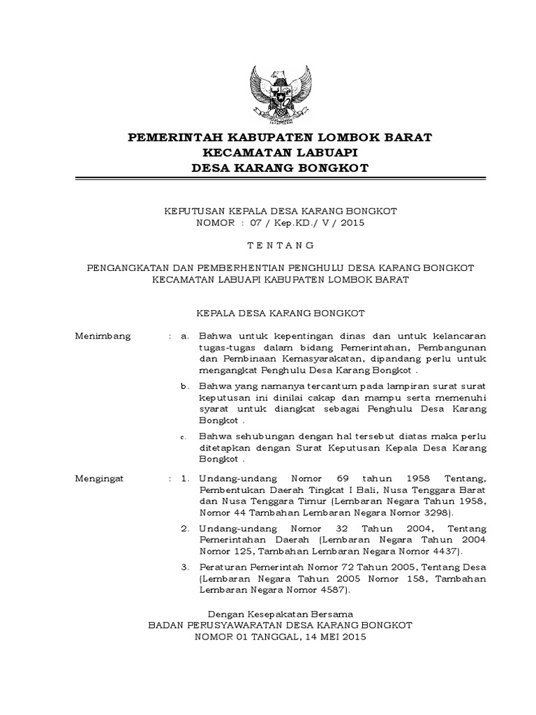 Berikut ini Kumpulan Format Terbaru SK Kepala Desa baik format PDF maupun Doc Word. Dalam sambutan Kepala Kantor menerangkan surat perintah Pelaksana Tugas yang diberikan tersebut mengingat proses pelayanan khususnya bidang kepenghuluan di Kecamatan Maulafa harus terus dilaksanakan. Beberapa Contoh Surat Pengesahan Dari Penghulu Terbaru 2019.